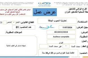 عرض عمل الملحقة المحلية للتشغيل غليزان ads عرض عمل خاص بالملحقة المحلية للتشغيل غليزان في مؤسسة :تعاونية الحبوب الجافة غليزان المنصب :AUDITEUR COMPTABLE عدد المناصب : 01 متطلبات المنصب: الاقامة بلدية غليزان السن من 25 سنة الى 30 سنة مؤهلات المنصب: شهادة ت ماستر …