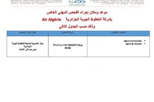 أكمل القراءة »موعد ومكان إجراء الفحص المهني الخاص الخاص بشركة الخطوط الجوية الجزائرية Air Algérie