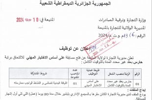 الجمهورية الجزائرية الديمقراطية الشعبية المنيعة في 10 جويلية 2024 وزارة التجارة وترقية الصادرات المديرية الولائية للتجارة بالمنيعة ads تعلن مديرية التجارة لولاية المنيعة عن فتح مسابقة على أساس الاختبار المهني للالتحاق برتبة حارس بعقد غير محدد المدة بالتوقيت الكامل. عن فتح مسابقة على أساس …