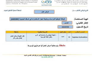 عرض عمل ads الجهة المعلنة: الوكالة الوطنية للدراسات ومتابعة انجاز الاستثمارات في السكك الحديدية (ANESRIF) الإطار القانوني: عمومي تاريخ التسجيل: 2024/07/09 مكان العمل: تندوف المنصب المطلوب: مهندس هيدروليكي العدد: 01 الشروط المطلوبة: شهادة مهندس أو ماستر 2 في الري. إتقان اللغة الفرنسية. الملاحظات: يتم …