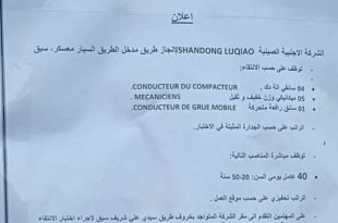 إعلان ads الشركة الأجنبية الصينية SHANDONG LUQIAO لإنجاز طريق مدخل الطريق السيار معسكر، سيق توظف على حسب الانتقاء: 04 سائقي آلة دك 05 ميكانيكي وزن خفيف و ثقيل 01 سائق رافعة متحركة الراتب على حسب الجدارة المثبتة في الاختبار توظف مباشرة المناصب التالية: 40 …