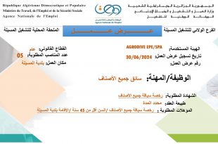 الجمهورية الجزائرية الديمقراطية الشعبية وزارة العمل والتشغيل والضمان الاجتماعي الوكالة الوطنية للتشغيل الفرع الولائي للتشغيل المسيلة الملحقة المحلية للتشغيل المسيلة عرض عمل ads الهيئة المستخدمة: AGRODIVE EPE/SPA الوظيفة المهنة: سائق جميع الأصناف عدد المناصب المطلوبة: 05 مكان العمل: بلدية المسيلة رقم عرض العمل: تاريخ …