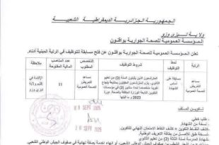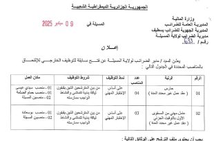 وزارة المالية المديرية العامة للضرائب المديرية الجهوية للضرائب بسطيف مديرية الضرائب لولاية المسيلة ads المسيلة في: 09 سبتمبر 2025 إعــــلان يعلن مدير الضرائب لولاية المسيلة عن فتح مسابقة للتوظيف الخارجي للإلتحاق بالمناصب المحددة في الجدول التالي: الرقمالرتبةعدد المناصبنمط التوظيفشروط التوظيفمكان العمل01حارس (عقد عمل غير …