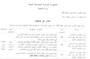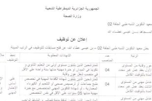 وزارة الصحة معهد التكوين شبه الطبي الحلفة 02 المجاهد بن عيسى عطاء الله ads إعلان عن توظيف يعلن معهد التكوين شبه الطبي الحلفة 02 – بن عيسى عطاء الله، عن فتح مسابقات للتوظيف في الرتب المبينة. الرتبةعدد المناصبالشهادات المطلوبةملاحظةعون وقاية من المستوى الأول04للمترشحين الذين …