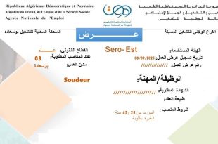 وزارة العمل والتشغيل والضمان الاجتماعي الوكالة الوطنية للتشغيل الفرع الولائي للتشغيل المسيلة الملحقة المحلية للتشغيل بوسعادة ads الهيئة المستخدمة: Sero-Est القطاع القانوني: عام تاريخ تسجيل عرض العمل: 2025/09/08 مكان العمل: بوسعادة الوظيفة/المهنة: Gestionnaire De Ressources Humaines شروط المنصب: السن ما بين 25 و 45 …