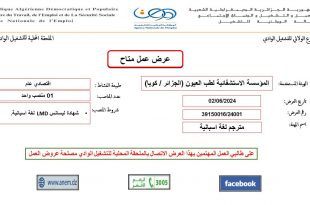 الجمهورية الجزائرية الديمقراطية الشعبية وزارة العمل والتشغيل والضمان الاجتماعي الوكالة الوطنية للتشغيل الملحقة المحلية للتشغيل الوادي الفرع الولائي للتشغيل الوادي ads عرض عمل الهيئة المستخدمة: المؤسسة الاستشفائية لطب العيون الجزائر/كوبا طبيعة النشاط: اقتصادي عام عدد المناصب: 01 منصب واحد تاريخ العرض: 02/06/2024 رقم العرض: …
