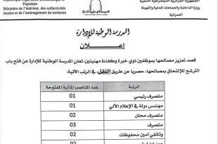 الجمهورية الجزائرية الديمقراطية الشعبية وزارة الداخلية والجماعات المحلية والتهيئة العمرانية المدرسة الوطنية للإدارة إعلان ads قصد تعزيز مصالحها بموظفين ذوي خبرة وكفاءة مهنيتين تعلن المدرسة الوطنية للإدارة عن فتح باب الترشح للإلتحاق بمصالحها، حصريا عن طريق النقل في الرتب الآتية: الرتبةعدد المناصب المالية المفتوحةمتصرف …