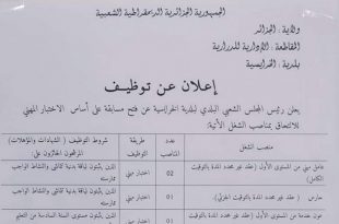 الجمهورية الجزائرية الديمقراطية الشعبية ولاية الجزائر إعلان عن توظيف بلدية الخرايسية ads يعلن رئيس المجلس الشعبي البلدي لبلدية الخرايسية عن فتح مسابقة على أساس الاختبار المهني للالتحاق بمناصب الشغل الآتية: منصب الشغلعدد المناصبطريقة التوظيفشروط التوظيف (الشهادات والمؤهلات)عامل مهني من المستوى الأول (عقد غير محدد …