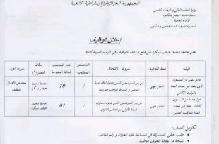 وزارة التعليم العالي و البحث العلمي جامعة محمد خيضر بسكرة إعلان توظيف ads تعلن جامعة محمد خيضر بسكرة عن فتح مسابقة للتوظيف في الرتب المبينة أدناه مكان التعيينعدد المناصبالتخصصالمطلوبشروط الإلتحاقنمط التوظيفالرتبةجامعة محمد خيضر بسكرة10مخصص الأعمال التنظيفمن بين المترشحين الذين يثبتون لياقة بدنية التماشي و …