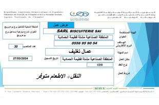 عرض عمل الجمهورية الجزائرية الديمقراطية الشعبية وزارة العمل والتشغيل والضمان الاجتماعي الوكالة الوطنية للتشغيل الملحقة المحلية للتشغيل برج بوعريريج شركة بسكويت ads الهيئة المستخدمة: SARL BISCUITERIE SAI العنوان: المنطقة الصناعية مشتة فطيمة الحمادية عدد المناصب: 41 تاريخ التسجيل: 27/05/2024 إعلان عن مسابقة توظيف بالمعهد …
