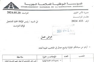 عرض عمل المؤسسة الوطنية للملاحة الجوية المؤسسة الوطنية للملاحة الجوية ETABLISSEMENT NATIONAL DE LA NAVIGATION AERIENNE ads 2024.05.20 : تمنراست مديرية الأمن الجوي مطار تمنراست عرض عمل عروض عمل بالمؤسسة الوطنية للملاحة الجوية في المناصب التالية المنصبالعددعون أمن07عون الصيانة والنظافة03 الشروط الإقامة الفعلية بولاية …
