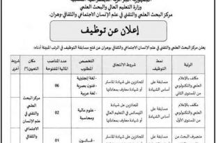 إعلان توظيف مركز البحث العلمي والتقني في علم الإنسان الاجتماعي والثقافي بوهران ads يعلن مركز البحث العلمي والتقني في علم الإنسان الاجتماعي والثقافي بوهران عن فتح مسابقة توظيف في الرتب التاللية المناصب المفتوحة: 06 مناصب باحث علمي من المستوى الثاني 02 منصب باحث علمي …