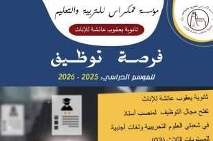 مؤسسة_تمكراس للترببة والتعليمثانوية يعقوب عائشة للإناث ads إعلان توظيف تعلن ثانوية يعقوب عائشة للإناث عن فتح مناصب توظيف لمنصب أستاذ(ة) للموسم الدراسي المقبل 2025 – 2026. في مادة العلوم الإسلامية في مادة العلوم الفيزيائية في مادة التاريخ و الجغرافيا في مادة اللغة الفرنسية شروط …