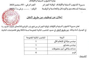 إعلان توظيف عن طريق النقل مديرية الشؤون الدينية والأوقاف لولاية الجزائر قيم ومناصب ادارية