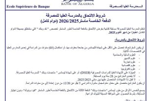 BANK OF ALGERIA بنك الجزائر المدرسة العليا للمصرفة ads شروط الالتحاق بالمدرسة العليا للمصرفة الدفعة الخامسة ماستر 2026/2025 (دوام كامل) تُنظم المدرسة العليا للمصرفة مسابقة وطنية بغرض الالتحاق بالدفعة الخامسة لطور الماستر تخصص “نقد وبنك” التي ستنطلق بصفة الدوام الكامل اعتبارا من شهر أكتوبر …