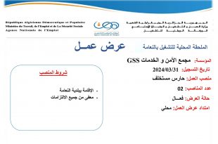 الفرع الولائي للتشغيل النعامة الملحقة المحلية للتشغيل النعامة عرض عمل مجمع الامن والخدمات GSS ads تعلن الملحقة المحلية للتشغيل النعامة عن عرض عمل بمجمع الامن والخدمات GSS كما هو موضح ادناه الهيئة المستخدمة: مجمع الامن والخدمات GSS المناصب المطلوبة: حارس مستخلف عدد المناصب: 02 …
