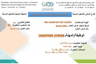 الفرع الولائي للتشغيل المسيلة الملحقة المحلية للتشغيل المسيلة عرض عمل مؤسسة البريد السريع EMS ads تعلن الملحقة المحلية للتشغيل المسيلة عن عرض عمل بمؤسسة البريد السريع EMS كما هو موضح ادناه الهيئة المستخدمة: مؤسسة البريد السريع EMS المناصب المطلوبة: chauffeur livreur عدد المناصب: 01 …