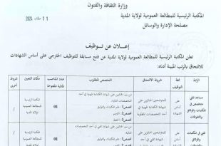 اعلان عن توظيف المكتبة الرئيسية للمطالعة العمومية ads تعلن المكتبة الرئيسية للمطالعة العمومية لولاية المدية عن فتح مسابقة توظيف في الرتب المبينة ادناه ملحق ادارة عدد المناصب 01 نمط التوظيف: على اساس الشهادة عون ادارة رئيسي عدد المناصب 01 نمط التوظيف: على اساس الشهادة …