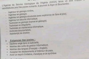 اعلان عن توظيف الوكالة الجزائرية للمساحة الجيولوجية (ASGA) ads تطلق الوكالة الجزائرية للخدمات الجيولوجية (ASGA) دعوة تقديم طلبات لشغل الوظائف التالية في الجزائر العاصمة وبومرداس: مهندس جيولوجيا التعدين مهندس جيولوجي, مهندس في الجيولوجيا الهيكلية مهندس أمن تكنولوجيا المعلومات، فني جيولوجيا (درجة في الجيولوجيا)، فني …