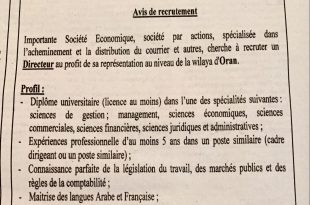 اعلان توظيف ads مؤسسة هامة، شركة ذات أسهم، متخصصة في مجال نقل وتوزيع البريد وغيره، توظف مديرا لفائدة ممثليتها بولاية وهران. الشروط: شهادة جامعية ( ليسانس على الأقل) في إحدى الإختصاصات التالية: علوم التسيير، المناجمنت، العلوم الإقتصادية، العلوم التجارية، العلوم المالية ، العلوم القانونية …