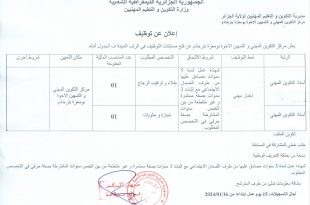 اعلان عن توظيف وزارة التكوين المهني والتمهين ads تعلن وزارة التكوين المهني والتمهين عن فتح مسابقة توظيف على أساس الشهادات والاختبار المهني لفائدة مؤسسات التكوين والتعليم المهنيين في الولايات التالية: عين تيموشنت تيارت النعامة سيدي بلعباس وهران مستغانم غليزان البيض بني عباس معسكر سعيدة …