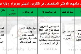 اعلان عن توظيف المهعد الوطني المتخصص في التكوين المهني ببودواو ads يعلن المهعد الوطني المتخصص في التكوين المهني ببودواو عن فتح مسابقة توظيف في الرتب المبينة ادناه استاذ متخصص في التكوين والتعليم المهنيين من الرتبة الثانية عدد المناصب 01 منصب نمط التوظيف: على اساس …