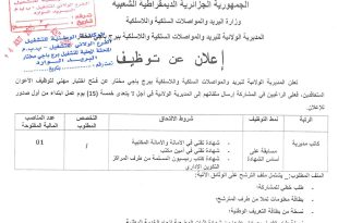 وزارة البريد والمواصلات السلكية واللاسلكية المديرية الولائية للبريد والمواصلات السلكية واللاسلكية ببرج باجي مختار ads إعــــلان عــــن تــــوظيــــف تعلن المديرية الولائية للبريد والمواصلات السلكية واللاسلكية ببرج باجي مختار عن فتح اختيار مهني لتوظيف الأعوان المتعاقدين، فعلى الراغبين في المشاركة إرسال ملفاتهم إلى المديرية الولائية …
