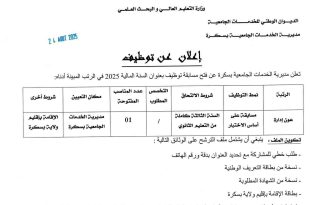 وزارة التعليم العالي والبحث العلمي الديوان الوطني للخدمات الجامعية مديرية الخدمات الجامعية ببسكرة ads إعلان عن توظيف تعلن مديرية الخدمات الجامعية ببسكرة عن فتح مسابقة توظيف بعنوان السنة المالية 2025 في الرتب المبينة أدناه: فترة التسجيلات وإيداع الملفات: تودع الملفات أو ترسل على العنوان …