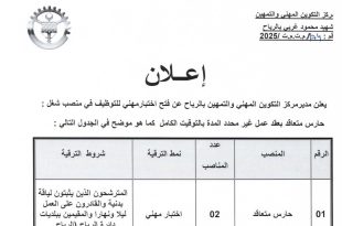 وزارة التكوين والتعليم المهنيين مركز التكوين المهني والتمهين شهيد محمود غربي بالرباح ads إعــلان يعلن مدير مركز التكوين المهني والتمهين غربي بالرباح عن فتح اختبار مهني للتوظيف في منصب شغل: حارس متعاقد بعقد عمل غير محدد المدة بالتوقيت الكامل كما هو موضح في الجدول …