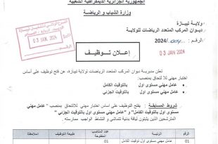 اعلان عن توظيف ديوان المركب المتعدد الرياضات لولاية تيبازة ads يعلن ديوان المركب المتعدد الرياضات لولاية تيبازة عن فتح مسابقة توظيف في الرتب المبينة ادناه عامل مهني من المستوى الاول بالتوقيت الكامل عدد المناصب 01 منصب نمط التوظيف: مسابقة على اساس الاختبار المهني عامل …