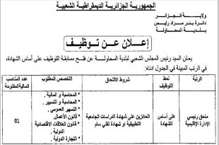 اعلان عن توظيف بلدية السحاولة بالجزائر العاصمة ads يعلن رئيس المجلس الشعبي البلدي لبلدية السحاولة بالحزائر العاصمة عن فتح مسابقة توظيف في الرتب المبينة ادناه ملحق رئيسي للادارة الاقليمية عدد المناصب 01 منصب نمط التوظيف: مسابقة على اساس الشهادة ملف المسابقة على أساس الشهادة …