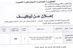 اعلان عن توظيف مديرية الخدمات الجامعية لولاية باتنة ads تعلن مديرية الخدمات الجامعية لولاية باتنة عن فتح مسابقة توظيف في الرتب المبينة ادناه عامل مهني من المستوى الاول عدد المناصب 08 منصب نمط التوظيف: مسابقة على اساس الاختبار المهني ملف مسابقة على اساس الاختبار …