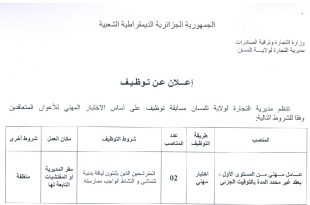 اعلان عن توظيف مديرية التكوين والتعليم المهنيين لولاية تندوف ads تعلن مديرية التكوين والتعليم المهنيين لولاية تندوف عن فتح مسابقة توظيف في الرتب المبينة ادناه عامل مهني من المستوى الثاني عدد المناصب 01 منصب نمط التوظيف: مسابقة على اساس الاختبار المهني كاتب مديرية عدد …