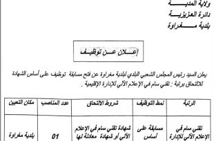 اعلان عن توظيف بلدية مغراوة ولاية المدية ads يعلن السيد رئيس المجلس الشعبي البلدي لبلدية مغراوة ولاية المدية عن فتح مسابقة توظيف في الرتب المبينة ادناه تقني سام في الاعلام الالي للادارة الاقليمية عدد المناصب 01 منصب نمط التوظيف: مسابقة على اساس الشهادة ملف …
