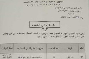 اعلان عن توظيف مركز التكوين المهني والتمهين محمد عرفاوي المنظر الجميل قسنطينة ads تعلن مركز التكوين المهني والتمهين محمد عرفاوي المنظر الجميل قسنطينة عن فتح مسابقة توظيف في الرتب المبينة ادناه عون ادارة عدد المناصب 01 منصب نمط التوظيف: مسابقة على اساس الاختبار ملف …