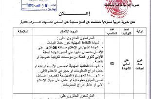 اعلان عن توظيف مديرية النربية لولاية تمنراست ads تعلن مديرية النربية لولاية تمنراست عن فتح مسابقة توظيف في الرتب المبينة ادناه مساعد مهندس من المستوى الثاني في الاعلام الالي عدد المناصب 01 منصب نمط التوظيف: مسابقة على اساس الاختبار عون حفظ البيانات عدد المناصب …