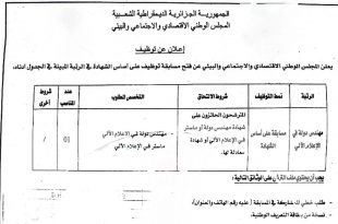 اعلان عن توظيف المجلس الوطني الاقتصادي والاجتماعي والبيئي ads تعلن المجلس الوطني الاقتصادي والاجتماعي والبيئي عن فتح مسابقة توظيف على اساس الشهادة في الرتب المبينة ادناه مهندس دولة في الاعلام الالي عدد المناصب 01 منصب نمط التوظيف: مسابقة على اساس الشهادة ملف المسابقة على …