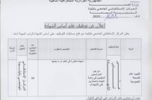 اعلان عن توظيف المركز الاستشفائي الجامعي بالبليدة ads يعلن المركز الاستشفائي الجامعي بالبليدة عن فتح مسابقة توظيف على اساس الشهادة في الرتب المبينة ادناه طبيب عام في الصحة العمومية عدد المناصب 10 منصب نمط التوظيف: مسابقة على اساس الشهادة ملف المسابقة على أساس الشهادة …