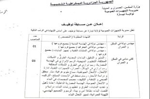 اعلان عن توظيف المعهد الوطني للاراضي و السقي و صرف المياه ads تعلن ادارة المعهد الوطني للاراضي و السقي و صرف المياه عن فتح مسابقة توظيف على اساس الاختبار المهني في الرتب المبينة ادناه عامل مهني من المستوى الاول بالتوقيت الجزئي عدد المناصب 01 …