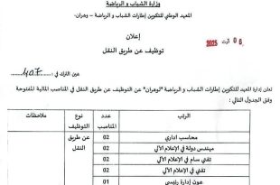 وزارة الشباب و الرياضة المعهد الوطني لتكوين إطارات الشباب و الرياضة – وهران- إعلان توظيف عن طريق النقل ads تعلن إدارة المعهد لتكوين إطارات الشباب و الرياضة “وهران” عن التوظيف عن طريق النقل في المناصب المالية المفتوحة وفق الجدول التالي: الرتب محاسب إداري 02 …