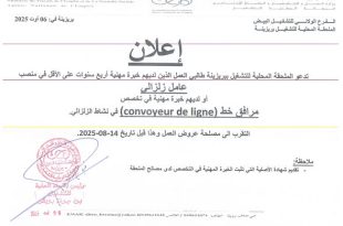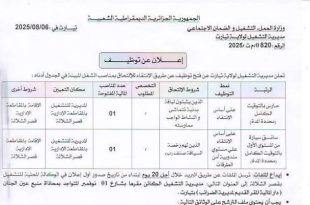 وزارة العمل و التشغيل و الضمان الاجتماعي الوكالة الوطنية للتشغيل فرع ولاية البيض الملحقة المحلية للتشغيل بريزينة ads بريزينة في 06 أوت 2025 إعـــلان تدعو الملحقة المحلية للتشغيل بريزينة طالبي العمل الذين لديهم خبرة مهنية أربع سنوات على الأقل في منصب: عامـل زلزالـي أو …