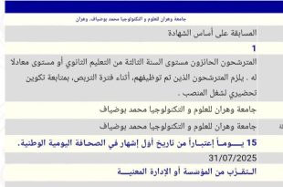 أكمل القراءة »اعلان عن توظيف بجامعة وهران للعلوم والتكنولوجيا محمد بوضياف وهران