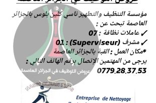 اعلانات توظيف الولايات المعنية الجزائر العاصمة، بومرداس، المسيلة، الجلفة، بسكرة يرجى من المهتمين التقرب من الادارة او الملحقة المحلية المعنية بالعرض او ارسال السيرة الذاتية حسب طبيعة الاعلان ads توظيف بالقبة بالجزائر العاصمة ✓ عاملات نظافة : 07 ✓ مشرف : 01 اعلان عن …
