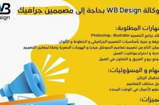 وكالة wb design بحاججة إلى مصممين جرافيك ads المهارات المطلوبة: -اتقان برامج التصميم: photoshop و illustrator -معرفة و خبرة باساسيات التصميم الجرافيكي و الخطوط و الألوان -التمكن التام من تصميم تصاميم السوشل ميديا و الهويات البصرية وفقا لمعايير التصميم -الجدية و احترام مواقيت العمل …