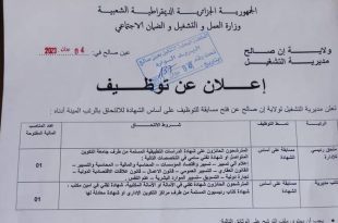 اعلان عن توظيف مديرية التشغيل لولاية عين صالح ads تعلن مديرية التشغيل لولاية عين صالح عن فتح مسابقة توظيف على اساس الشهادة و علىى اساس الانتقاء في المناصب المدرجة ادناه ملحق رئيسي للادارة عدد المناصب 01 منصب مسابقة على اساس الشهادة كاتب مديرية عدد …