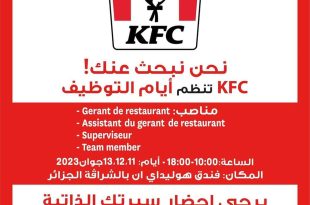 اعلان توظيف مطعم الدجاج المقلي KFC ads مطعم الدجاج المقلي المشهور عالميا KFC الذي قرر الدخول إلى السوق الجزائرية رسميا شهر ماي الماضي، يعلن عن فتحه أبواب التوظيف أيام 11, 12 و 13 جوان 2023 بفندق هوليداي إن بالشراڨة بالجزائر العاصمة، و هذا من …