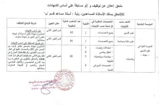 اعلان عن توظيف المدرسة العليا في علوم التسيير عنابة ads تعلن المدرسة العليا في علوم التسيير عنابة عن فتح مسابقة توظيف على اساس الشهادة في الرتب المبينة ادناه استاذ مساعد قسم ب عدد المناصب 04 منصب نمط التوظيف على اساس الشهادة للحائزين على شهادة …