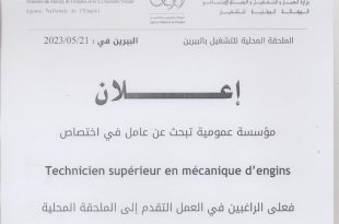 الملحقة المحلية للتشغيل بالبيرين البيرين في 21 ماي 2023 اعلان ads مؤسسة عمومية تبحث عن عامل في اختصاص technicien superieur en mecanique d”engins فعلى الراغبين في العمل التقدم الى الملحقة المحلية للتشغيل بالبيرين مرفقين ببطاقة طال العمل وشهادة تثبت الخبرة في هذا المجال ملاحظة …
