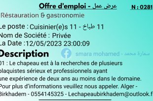 اعلانات توظيف الولايات المعنية الجزائر العاصمة، سيدي بلعباس، سكيكدة، ورقلة وبشار ads يرجى من المهتمين التقرب من الادارة المعنية بالعرض او ارسال سيرة ذاتية حسب طبيعة الاعلان عرض عمل في منصب : 11 طباخ 11 Cuisinier(e)s اعلان عن توظيف قصر الثقافة مالك شبل بسكيكدة …