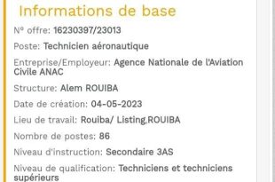 إعلان توظيف في الوكالة الوطنية للطيران المدني ANAC (86 منصب) لتقديم طلب https://wassitonline.anem.dz/offre/DetailOffrePublic/320d5be0-6380-4051-989c-790f1f93974b او التقدم الي ملحقة الرويبة بالعاصمة ads N° offre: 16230397/23013 Poste: Technicien aéronautique Entreprise/Employeur: Agence Nationale de l’Aviation Civile ANAC Structure: Alem ROUIBA Date de création: 04-05-2023 Lieu de travail: Rouiba/ …